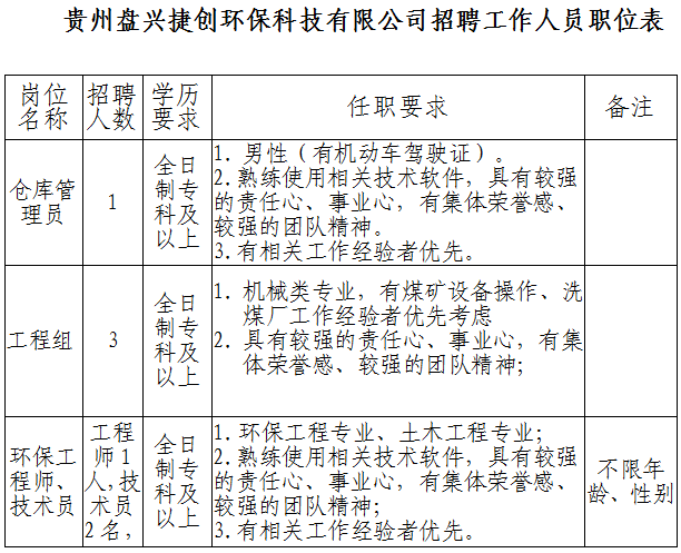貴州盤興捷創(chuàng)環(huán)?萍加邢薰2019年面向社會公開招聘倉庫管理員1名,技術(shù)工程師1名,技術(shù)員2名,工程組3名。具體招聘職位詳見附件1《貴州盤興捷創(chuàng)環(huán)保科技有限公司招聘工作人員職位表》。